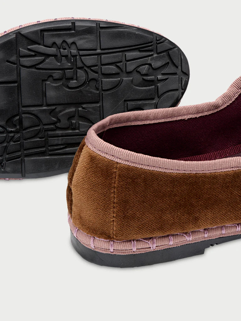 - Samt-Mary-Jane in Braun mit hellrosa Paspelierung und Schnallenverschluss.
